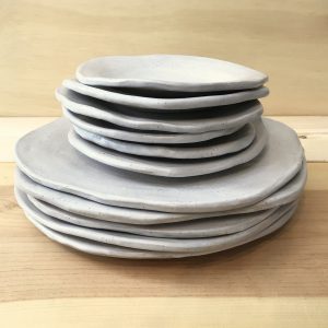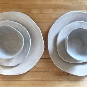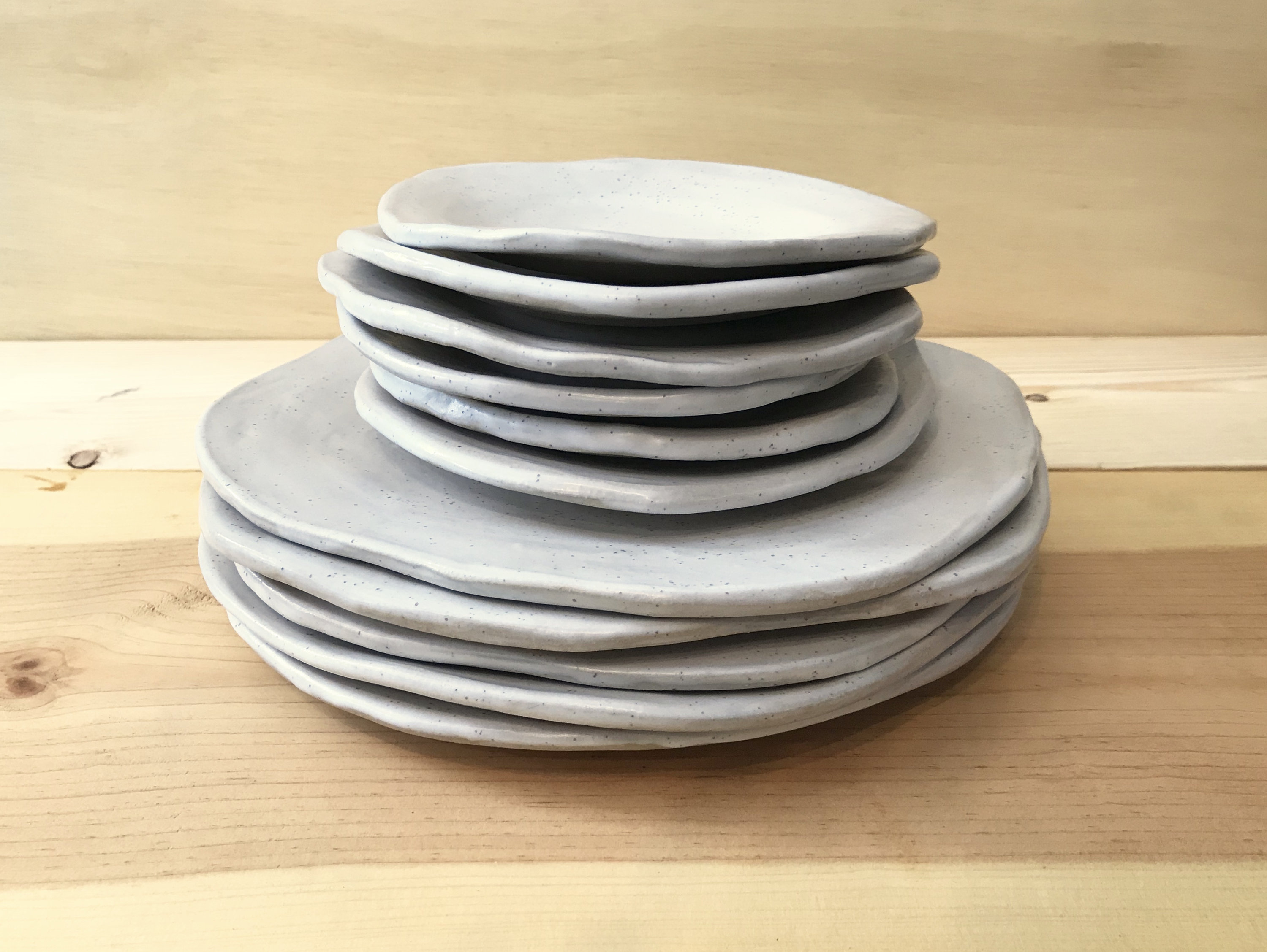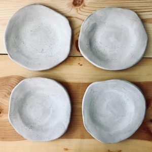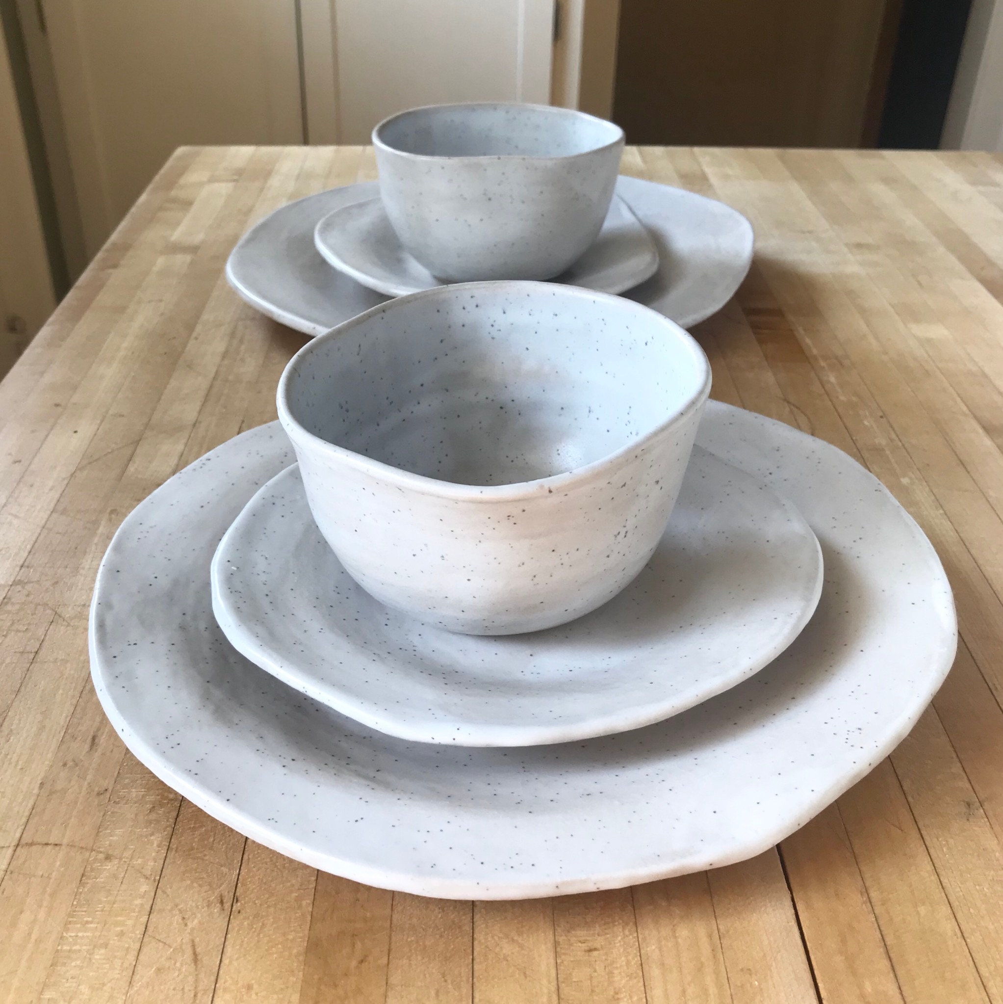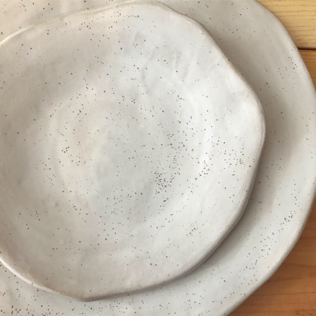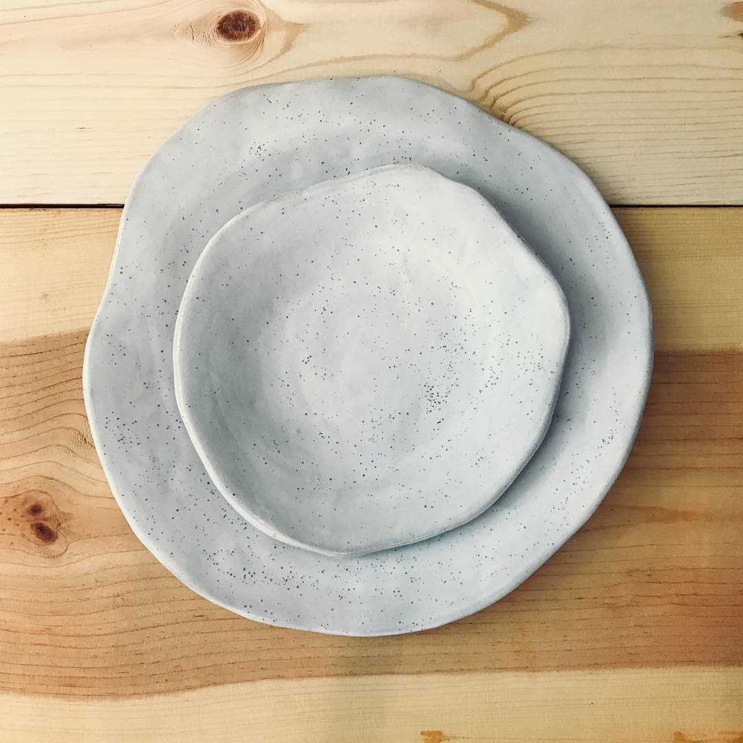 These one of a kind ceramic plates are handmade of stoneware clay. The design is both earthy and organic yet maintains a contemporary design with a minimalist look. Each plate is unique with slight variation to each piece adding interest to your dinner table. The plates are made with a thick slab of stoneware clay which makes it strong and durable for everyday use. They are glazed with a classy, timeless, white speckled glaze or plain white without the speckles. Both are non-toxic and food safe glazes.